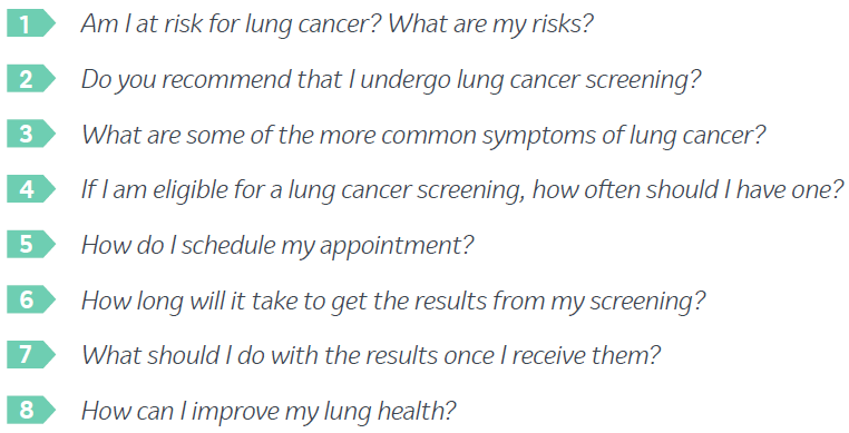 Here are some questions you could ask your doctor about lung cancer and lung cancer screenings: